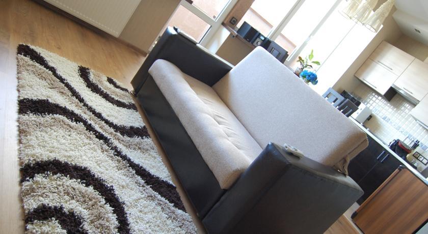 Во дворе дома есть бесплатные парковочные места для тех, кто приехал на своём транспорте. Данные апартаменты представляют собой зонированное пространство, где спальная зона снабжена потолочной приглушенной подсветкой. Здесь установлена современная стильная мебель, плазменный телевизор, кондиционер. В гостиной зоне есть кожаный диван. На кухне найдется холодильник, плита, посуда, стиральная машина.