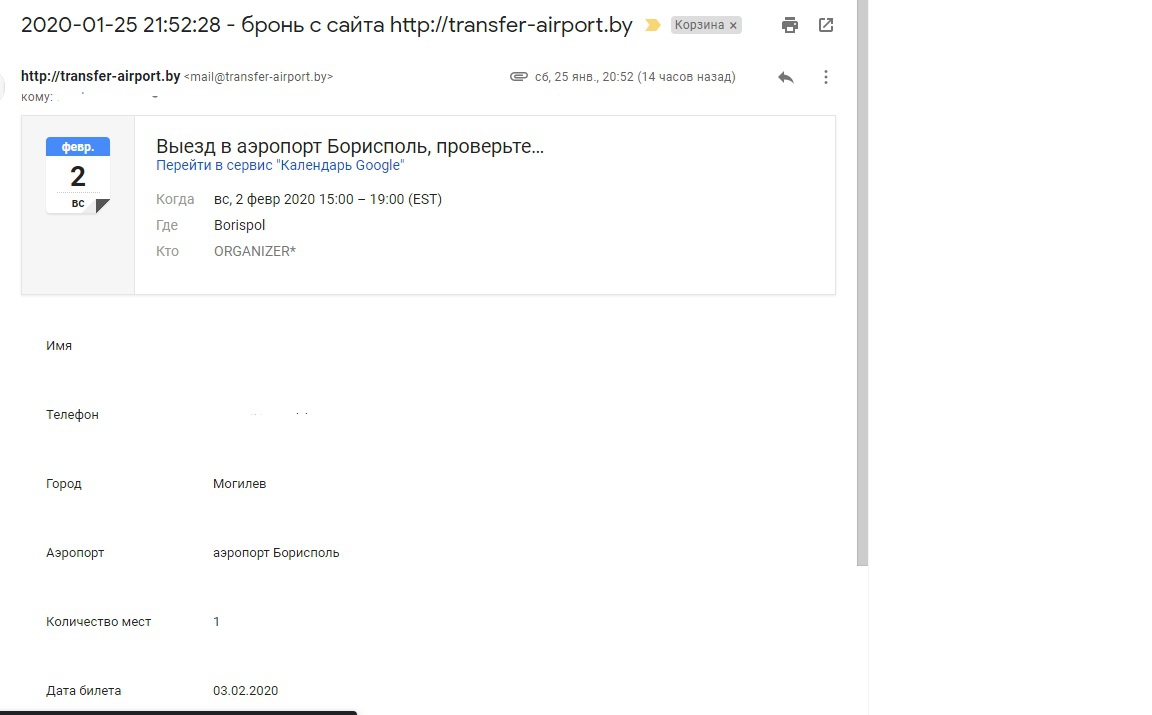 Я забронировала себе поездку в Борисполь и обратно через форму на сайте. На сайте не указано время отправления и прибытия. После заполнения формы мне пришел емэйл, в котором стояло время отправки, которое меня совершенно не устраивало. В пришедшем емэиле не было никакой информации, что за компания мне его прислала. Ни одного контактного телефона. Только название сайта в шапке и емэил с которого оно пришло. По названию из шапки нашла сайт, перезвонила по телефонам на сайте. Ответила заспанная девушка. Сказала, что их сайт и компания никаких емэилов не шлет вообще, что я у них не зарегистрирована никак, что их компания подстраивается под пассажиров в зависимости от того, когда у них вылет. Разговаривала совершенно по хамски. Я в шоке. Могла бы вообще не уехать и не попасть на самолет.