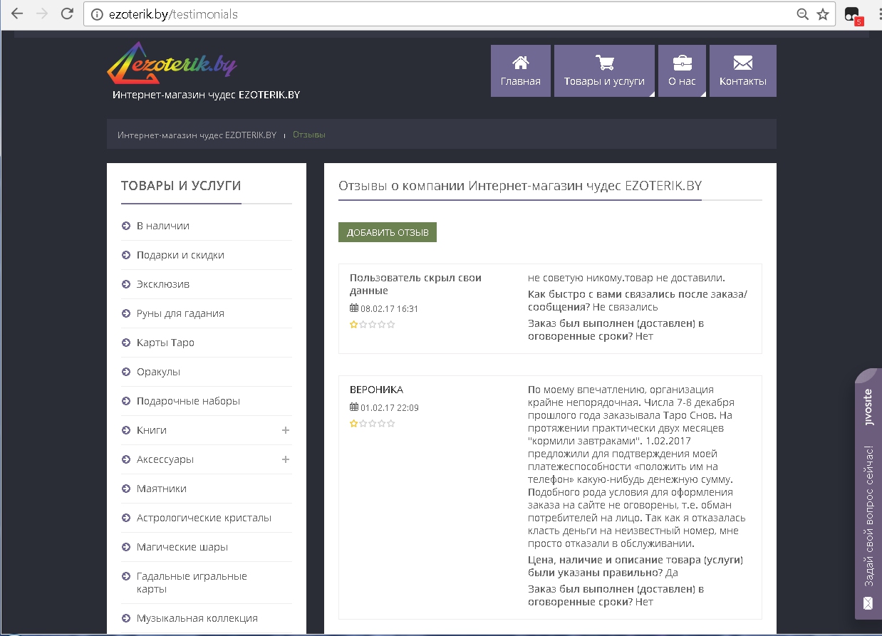 Осталась недовольна так называемым «обслуживанием». Сложилось впечатление, что организация крайне непорядочная. Рассказываю почему. Числа 7-8 декабря прошлого года связалась по телефону: +375 29 8 059 500 по вопросу приобретения Таро Снов. Первое впечатление было, очень хорошим. Я обрадовалась, что есть возможность заказать Таро Снов, так как эту колоду не очень просто достать. Кроме того, я выяснила у консультанта, что есть возможность заказать даже Таро Сакрального круга – колоду, которую я безуспешно пытаюсь приобрести на протяжении нескольких лет. Предполагая, что, если все пройдет хорошо, то буду и в дальнейшем заказывать в этом магазине, я уточнила, на каких условиях делается заказ. Девушка, принимавшая заказ, пояснила, что никаких специфических условий нет, поэтому я попросила оформить заказ на Таро Снов. Консультант сообщила, что сможет мне передать колоду 10 декабря. Указанная дата была для меня неудобна, поскольку, я собиралась уехать. Заказ я делала, так как товар, который я хотела приобрести, был указан в позиции «под заказ», следовательно, я полагала, что между заказом и непосредственной доставкой пройдет определенное время. Все это я объяснила девушке-консультанту, уточнив при этом, возможно ли забрать обещанную колоду после 18 декабря. В ответ на это девушка предложила мне для подтверждения моей платежеспособности «положить на телефон» какую-нибудь денежную сумму. Я четко и определенно сказала, что такие условия меня не устраивают и никаких денег ни на какие телефонные номера я класть не буду (прошу обратить на это внимание). Тем не менее, девушка приняла мой заказ. Вернувшись из поездки, я позвонила в «Эзотерик бай» по поводу своего заказа. Все та же девушка мне сообщила, что моя колода поступит ближе к новому году. Я удивилась, куда же делась колода, которую собирались мне передавать 10 декабря, но промолчала. Непосредственно перед новым годом мне позвонили из «Эзотерик бай» с вопросом, заинтересована ли я еще в колоде Таро Снов, то есть включать ли им ее в заказ (простите, а что у меня тогда принимали в начале декабря, чем весь месяц занимался магазин, если речь о включении в заказ идет только сейчас и опять-таки, что мне собирались передавать 10 декабря?) И сколько я еще готова ожидать колоду. Я подтвердила, что в колоде заинтересована и буду ожидать, сколько потребуется. Девушка уточнила, что поставка будет поле нового года. После нового года я сама вновь позвонила в «Эзотерик бай». Все та же девушка сообщила, что поставка будет в 20-х числах января. Все бы хорошо, но я зачем-то зашла на сайт магазина, где прочла, что команда магазина уходит в отпуск с 16 по 29 января и поставки в этот период осуществляться не будут. То есть, консультант прекрасно зная, что ни о какой поставке в 20-х числах января не может быть и речи, просто нагло лгала. 1 февраля мне позвонили из «Эзотерик бай» и уже хорошо известная мне девушка-консультант сообщила, что на днях ожидается поставка, заинтересована ли я еще в колоде Таро Снов и включать ли им ее в заказ (просто без комментариев, вопрос о включении в заказ поднимается спустя два месяца после первого звонка). Я в очередной раз подтвердила, что намерена приобрести Таро Снов. В ответ на это девушка вновь предложила мне для подтверждения моей платежеспособности «положить на телефон» какую-нибудь денежную сумму.