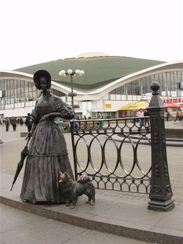 Чеховская Дама с собачкой – известный литературный персонаж. В нескольких городах этот образ, будто бы сошедший со страниц книги, запечатлен в виде городских скульптур. «Прогуливающуюся» девушку в наряде позапрошлого столетия вместе с маленьким четвероногим другом можно встретить на улицах Ялты и Сигнаги, Риги и Торуни, Липецка, Астрахани и многих других городов. Своя дама с собачкой есть и в Минске. Скульптура расположена в Советском районе столицы Беларуси на площади близ Комаровского рынка.