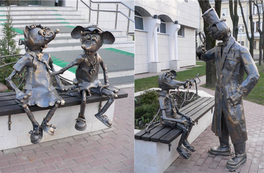 Городская скульптура Минска представлена самыми разными композициями, многие из которых связаны с профессиями (памятники балеринам, фотографу, почтальону, зодчему). Есть в городе и памятник, связанный с профессией врача, но скульптура эта необычна. Туристы не увидят здесь строго доктора в халате или медсестру с фонендоскопом. Возле здания офтальмологического центра «Новое зрение» стоит бронзовый кот-врач, смотрящий в лупу на сидящую на скамейке мышку-пациентку, а по другую сторону от лестницы, ведущей в клинику, находится еще одна массивная скамья с удобно расположившимися на ней двумя симпатичными бронзовыми мышками.