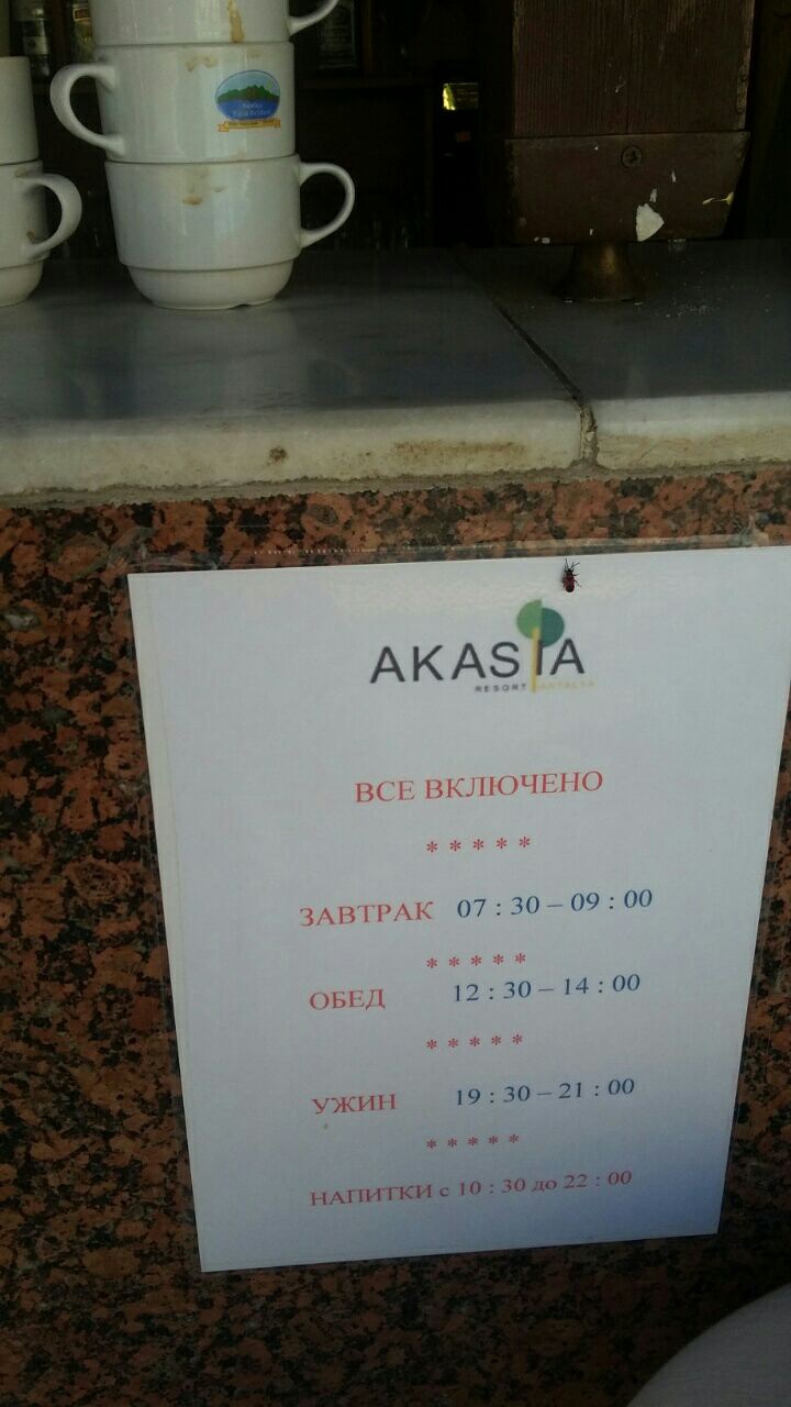Продали путевку, агенство "Два солнца" на Сурганова, 61, на двоих отель 3*** все включено. Было оговорено питание, соки мороженое на пляже, но этого не было. Итог! Всю неделю ели капустные листья, на обед выделяли по одной ножке куриной или котлеты из хлеба, водка 100 грамм в сутки выдавалась нашим, а немцам пили сколько хотели. Взяли Батона три куска, так чёрный вырвал из рук, типа много взяли. Отель Акасия ресорт Турция. Люди не портите себе отпуск! Обратитесь лучше в Tez Tur.