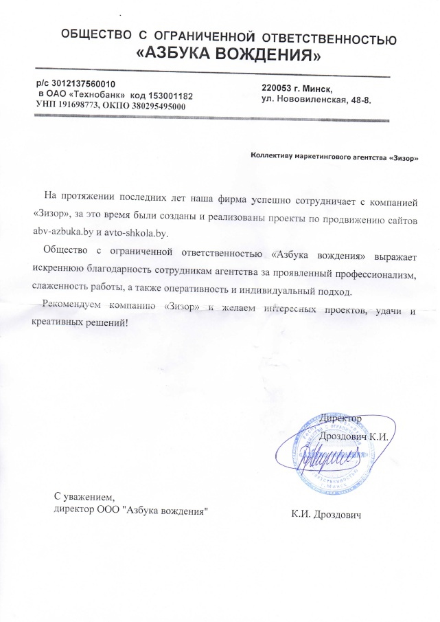 Общество с ограниченной ответственностью «Азбука вождения» выражает искреннюю благодарность сотрудникам агентства за проявленный профессионализм, слаженность работы, а также оперативность и индивидуальный подход. Рекомендуем компанию «Зизор» и желаем интересных проектов, удачи и креативных решений!