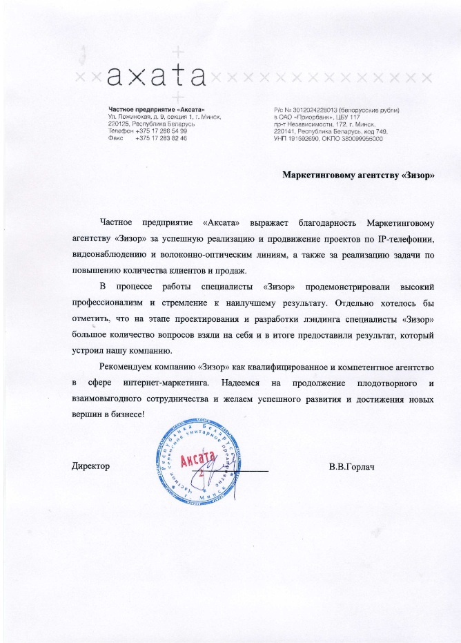 Частное предприятие «Аксата» выражает благодарность Маркетинговому агентству «Зизор» за успешную реализацию и продвижение проектов по IP-телефонии, видео наблюдению и волоконно-оптическим линиям, а также за реализацию задачи по повышению количества клиентов и продаж.