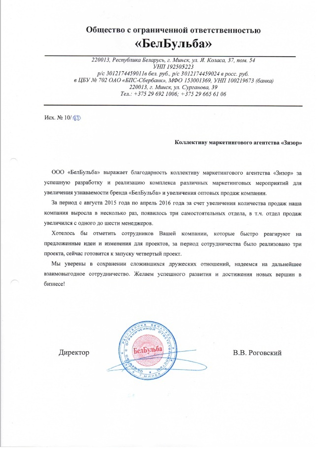 ООО «БелБульба» выражает благодарность коллективу маркетингового агентства «Зизор» за успешную разработку и реализацию комплекса различных маркетинговых мероприятий для увеличения узнаваемости бренда «БелБульба» и увеличения оптовых продаж компании.