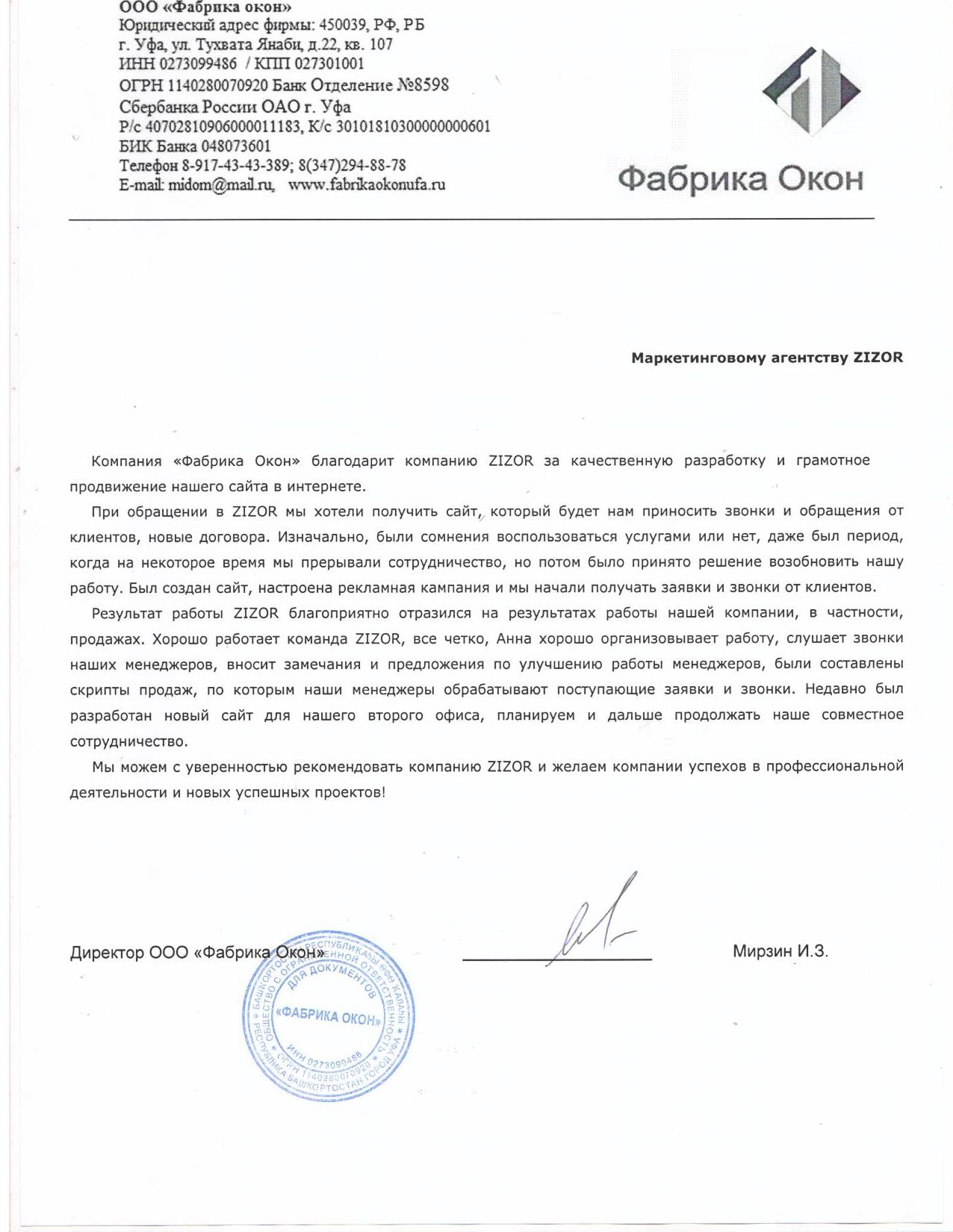 Компания «Фабрика Окон» благодарит компанию ZIZOR за качественную разработку и грамотное продвижение нашего сайта в интернете.