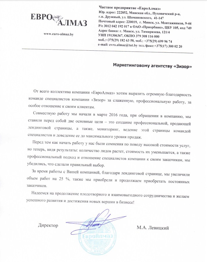 От всего коллектива компании «ЕвроАлмаз» хотим выразить огромную благодарность команде специалистов компании «Зизор» за слаженную, профессиональную работу, за особое отношение к своим клиентам.