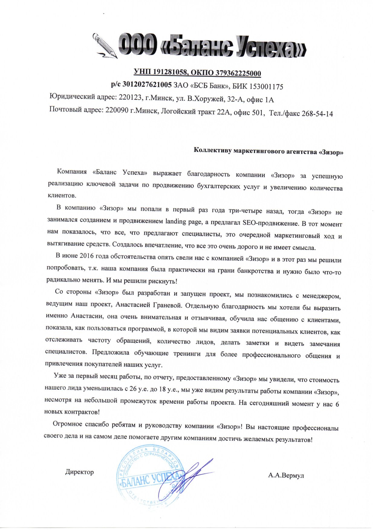 Компания «Баланс успеха» выражает благодарность компании «Зизор» за успешную реализацию ключевой задачи по продвижению бухгалтерских услуг и увеличению количества клиентов.